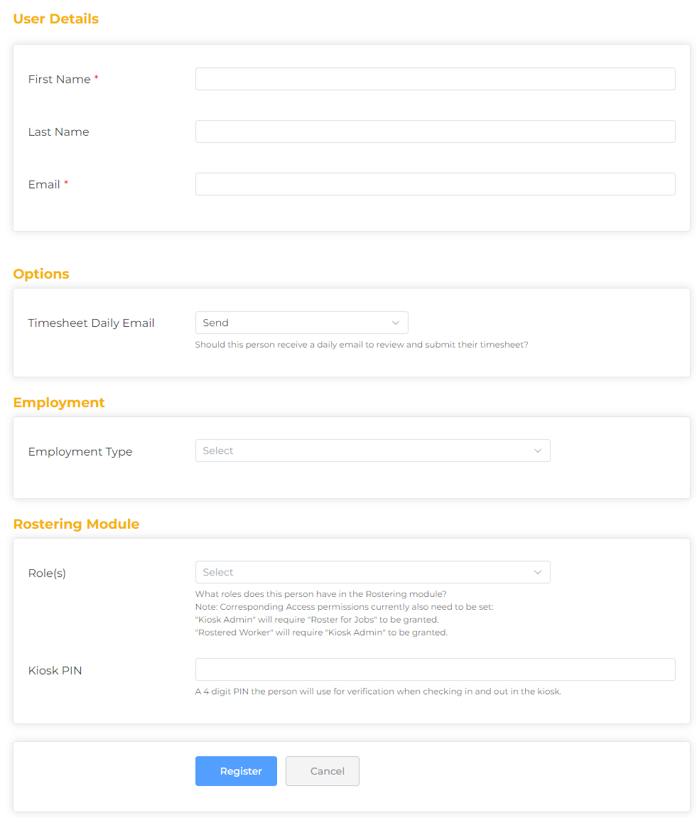 | Kiosk PIN | For those people who are checking in and out, a 4 digit PIN number needs to be specified which they will need to populate to check in, take breaks and check out for the day | Numbers only – must be 4 digits |