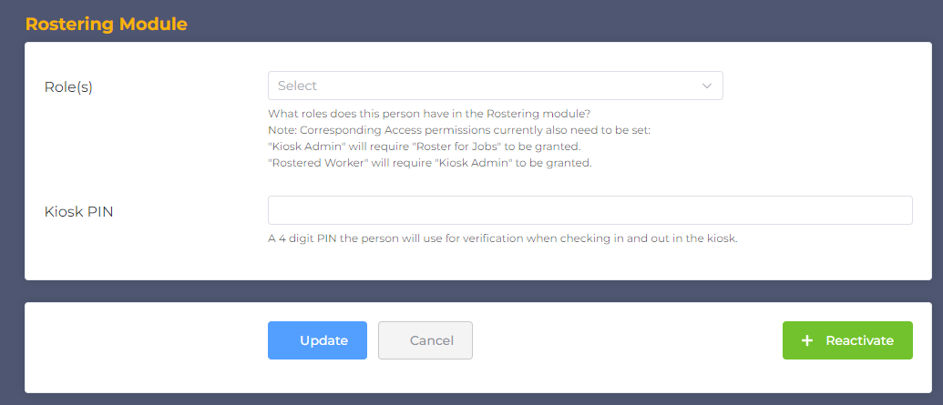 This will reactivate the user immediately. You can now allocate them to shifts, and they can now access the system again.
