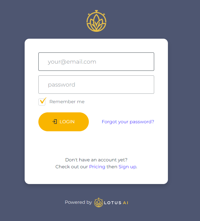 To access Kiosk mode, go to portal.lotusai.co on the computer or tablet which people will be using for checking in. This will take you to a login screen: