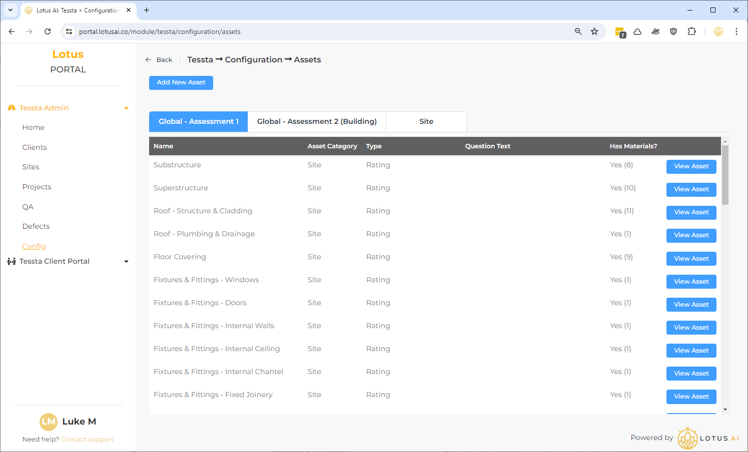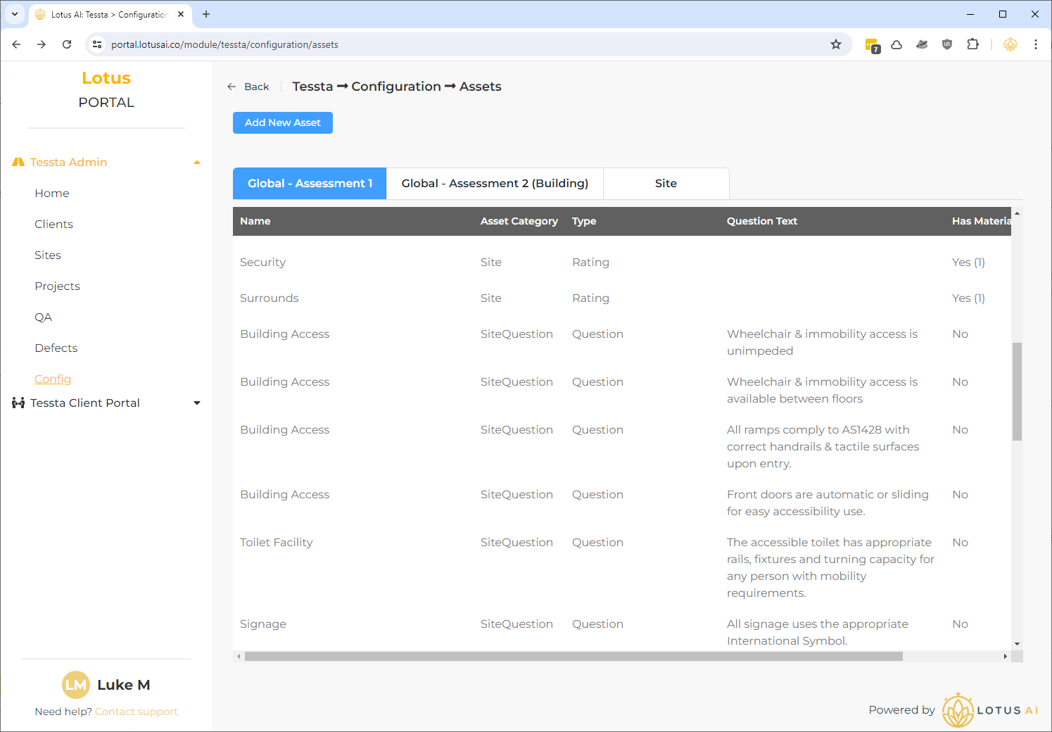 - “Global”: There are 2 types of global asset – “Assessment 1” and “Assessment 2 – Building”. These are the common assets that will be picked up automatically assigned to their corresponding assessments of the same name. So, when creating a project, adding a site and assigning either of those 2 assessments to the site, the corresponding assets will be automatically used in the app.