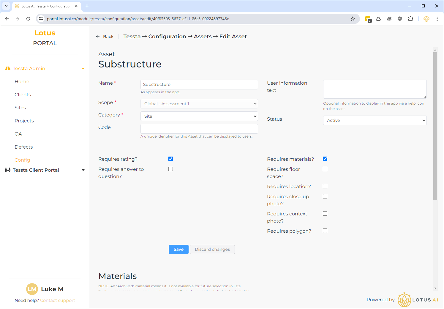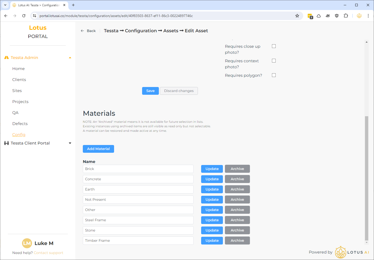 To have a materials list in the app, tick “Requires materials”. A new section below the checkboxes will appear to allow materials to be added and managed.