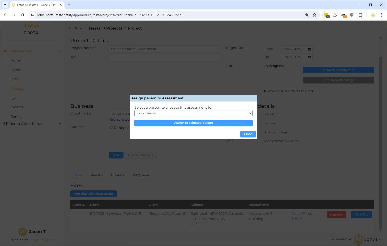 To assign a site assessment to someone, select the “assign” link under the name (which will initially be “Unassigned”). Select a person from the list and select “Assign to selected person”. This can be changed at any time.